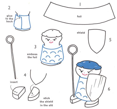 - A champagne cork with its metal “cap” for the helmet; if the metal is damaged, use thick pain and colorless nail polish to fix it back and red soft-tip pens