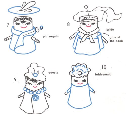• For the first way, take a piece of ribbon. Make some small folds in it and glue it on the cork with the closing in the back. Put the arms in place. Cross a little piece of ribbon in front and hold it there with a pin. This hides the top. The bride is dressed this way (see drawing 8).