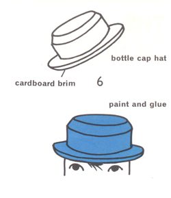 To make a hat, use a bottle cap shaped like the one shown in drawing 6. Paint it with thick black gouache. Place it on the head with a drop of glue.